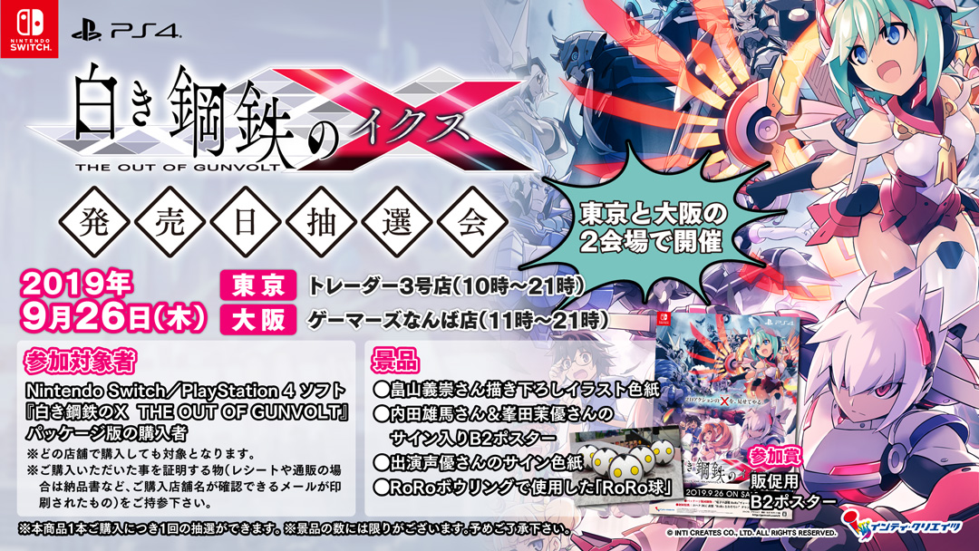 『白き鋼鉄のX(イクス) THE OUT OF GUNVOLT』の発売日・9月26日(木)に、パッケージ版購入者を対象とした抽選会を行います!過去、弊社タイトルの発売日抽選会は東京のみでしたが、今回は東京と大阪の2会場で開催します!