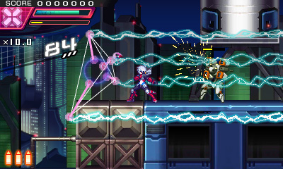 Copen(VA:Kosuke Masuo)[Time to send you to the scrapyard!]Copen is the son a famous scientist whose research detailed the dangerous threat that adepts pose to society. To honor the dying wish of his late father, Copen fights to eradicate all adepts from the world.While he may be a normal human without any septimal powers, his technological prowess and combat abilities exceed that of many adepts.Since the events of the last game, Copen has completely revamped his gear. His new gear is designed for maximum mobility, which allows him to dash through the air and perform mid-air attacks like never before. He is also now accompanied by LoLo, a combat bot that aids him offense, defense, and mobility.